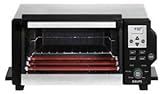 Krups high-speed quartz heating system takes masterful control of heat in the chamber. Each set of quartz heating element, both top and bottom, is alternately powered at the full 1600 watts to maximize the effect of radiant heat. The heat distribution is aided by a special reflective crumb tray that directs this important form of heat to all corners for excellent results. Convection heat, important for longer baking times, circulates heated air around the food for the best result in the fastest time. The defrost function uses the convection fan only and gently and evenly defrosts food without producing hot spots. This 6-slice toaster oven with 6 preset cooking functions- Pastry, Bagels, Brownies, Cookies, Thick Pizza, Thin Pizza has temperature controls in 25 degree increments from 150-450 degrees, a digital timer from 1 minute to 90 minutes and an auto shut off after elapsed time. For toasting, it has 9 levels or browning with a countdown timer. Illuminated LCD control panel with easy to use controls and high quality soft touch buttons, it has a digital clock that displays when the cooking functions are not in use. The non-stick interior surface is durable and easy to clean. This unit includes a non-stick bake pan, broiling tray and thermal resistant tongs for safe removal of hot pans or food and comes with a 1-year warranty.