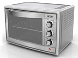 With its brushed stainless-steel housing, this convection countertop oven from Oster offers a lot more than just refined good looks. The oven comes equipped with convection technology, which distributes heat evenly for thorough cooking and excellent results. Put the appliance to use as a second oven when needing extra cooking space during the holidays-or as an energy-efficient alternative to turning on the full-size oven. The unit's generously sized interior offers enough space to accommodate a large frozen pizza, while its adjustable rack can be placed in two different positions to allow for customizable space, whether cooking a tall roast or baking chocolate-chip cookies. Furthermore, the countertop oven offers three user-friendly control dials for selecting the function (broil, bake, toast); adjusting the temperature up to 450 degrees F; and setting the 60-minute timer, which shuts off automatically and offers a "ready" bell signal (timer can also be turned to the stay-on position for continuous cooking). Other highlights include adjustable-heat broiling, a transparent door for checking the status of food at a glance, an "on" indicator light, a wide easy-grip door handle, a quick-clean interior, and an internal removable crumb tray for convenient cleanup. A durable baking pan comes included.